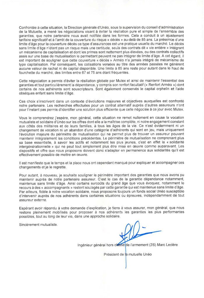 Dans l’encart intitulé « Garanties maintien d’autonomie/dépendances et décès – Arméo », en page 9 de la brochure « Être Unéo » du mois d’octobre, les lecteurs sont informés que le conseil d’administration d'UNEO a voté le 18 septembre 2025 l’arrêt à 85 ans du versement d’un capital de base de 2000 € en application de la garantie décès. Notre président a adressé un courrier le 17 décembre 2025 au président d'Unéo demandant les informations juridiques, techniques et financières qui ont conduit à cette décision.La réponse d'UNEO est présentée ci-dessous :